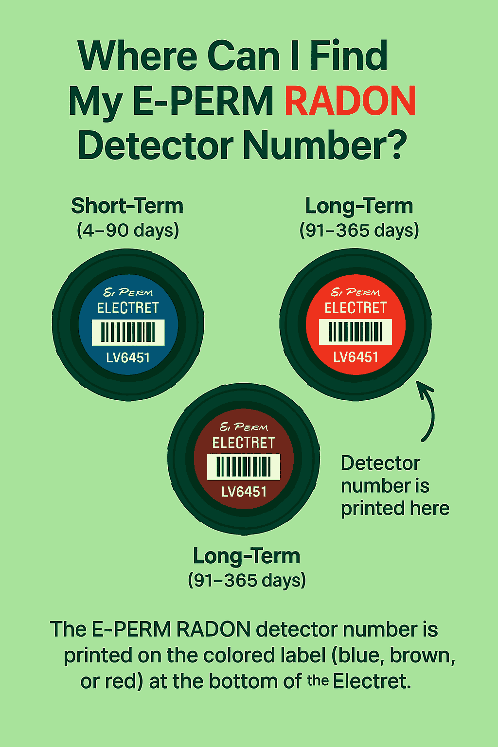 The E-PERM RADON detector number is printed on the colored label (blue, brown, or red) located on the bottom of the Electret.