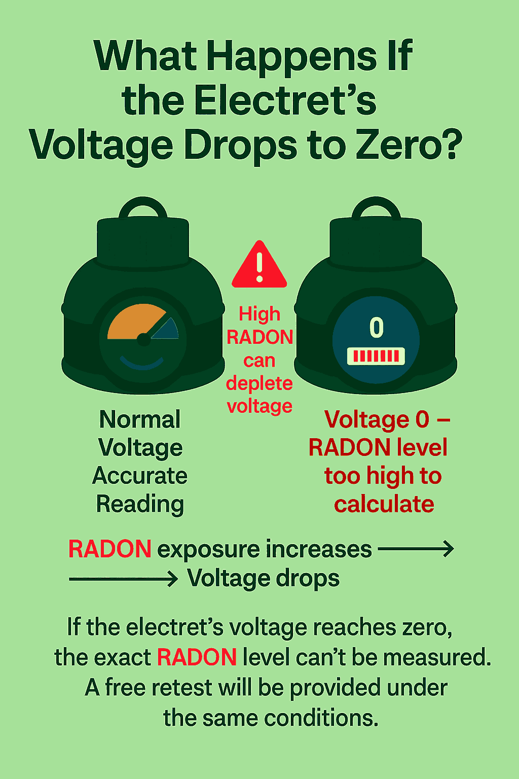 If the RADON level is extremely high, the electret’s voltage can drop to zero (0) before the test ends. When this happens, it’s not possible to calculate the exact RADON concentration.