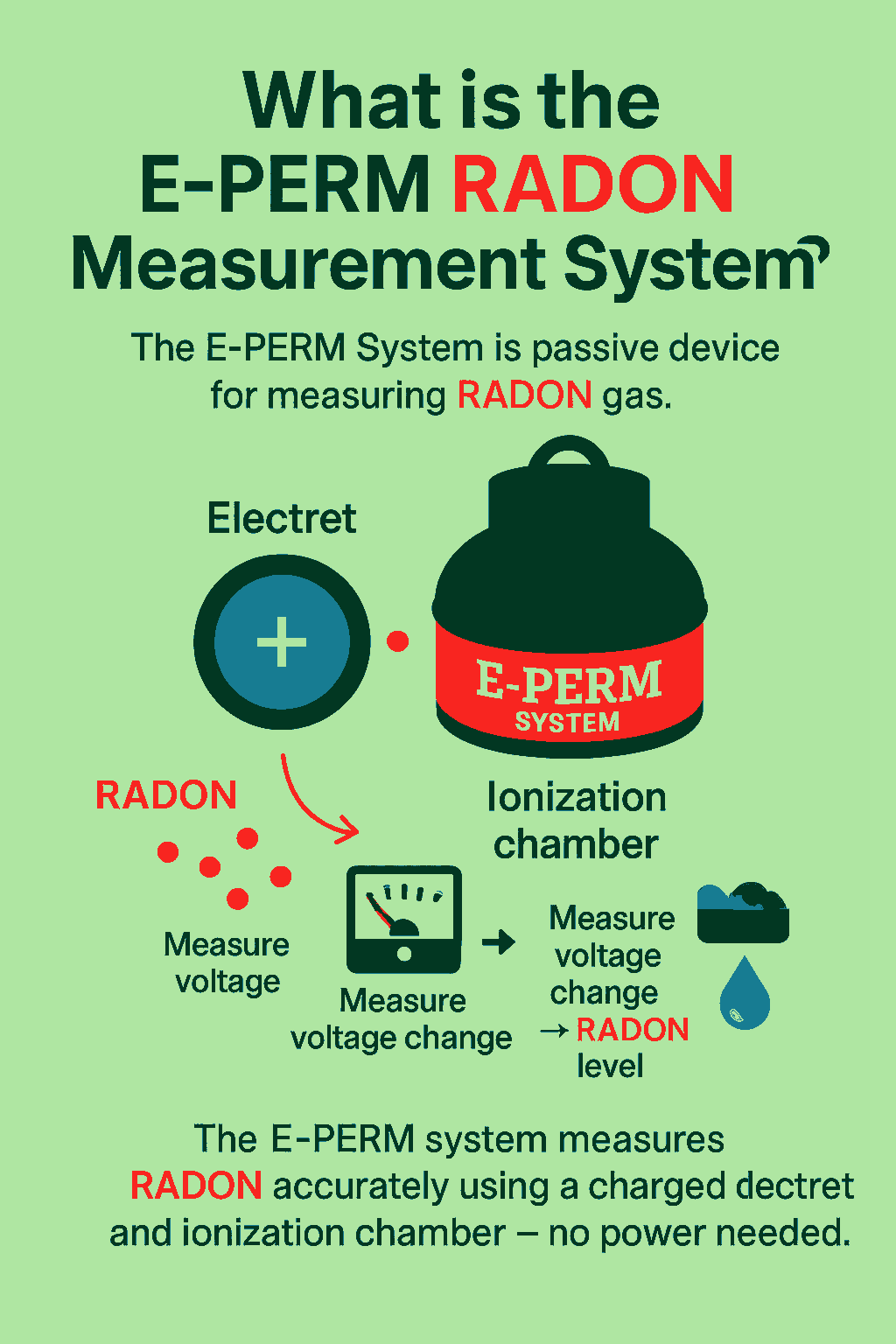 Both E-PERM RADON test kits work on the same principle - using an electret, a charged Teflon disc that gradually loses voltage as it’s exposed to RADON gas and its decay particles.