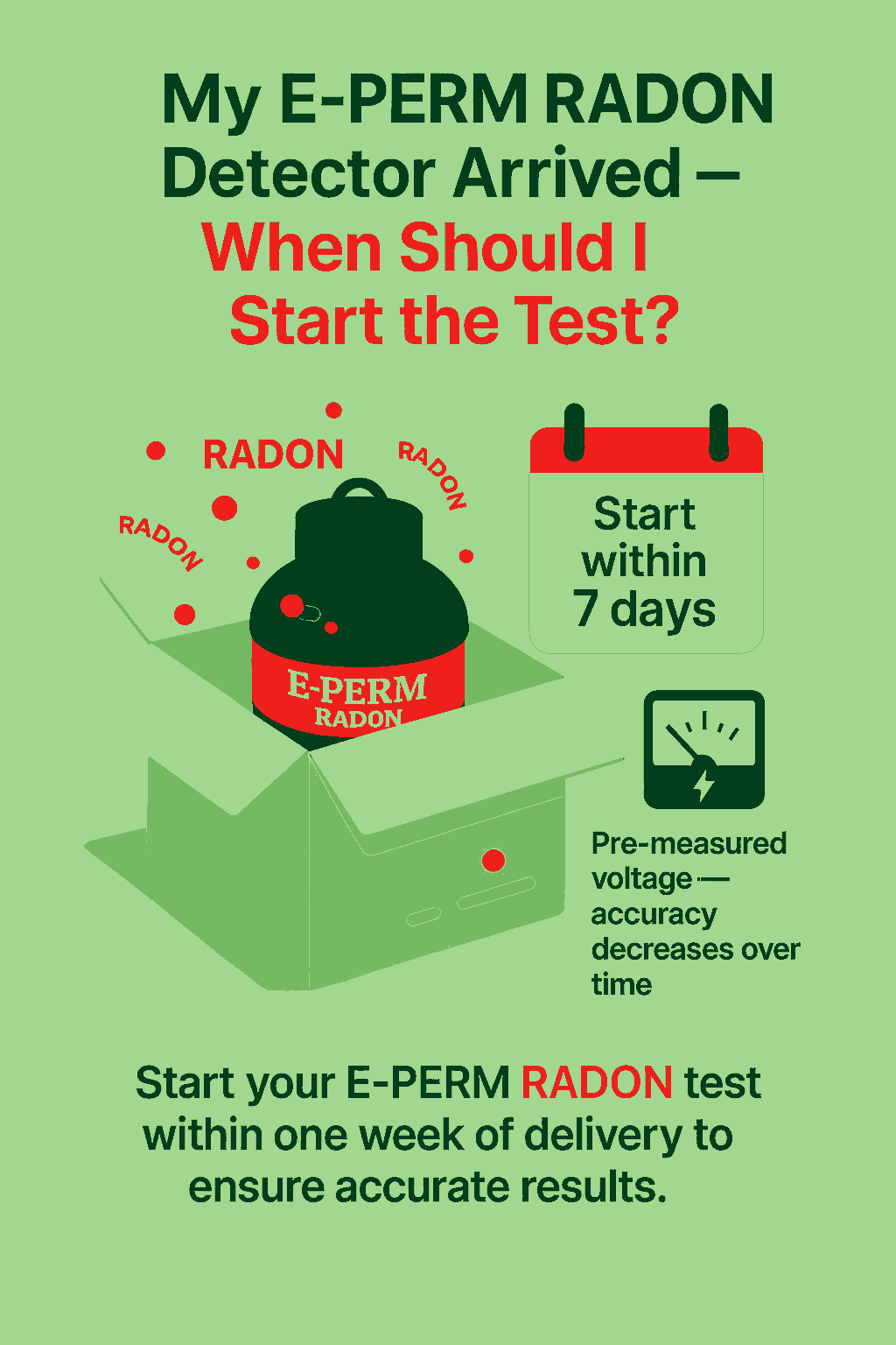 To ensure accurate results, we recommend starting your RADON test within one week of receiving the device, as a small amount of charge may naturally dissipate over time.
