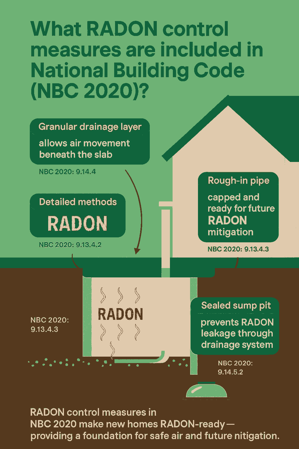 The NBC 2020 includes several key construction measures to help limit RADON entry into new homes. These measures prepare the building for safe ventilation and future mitigation if needed: