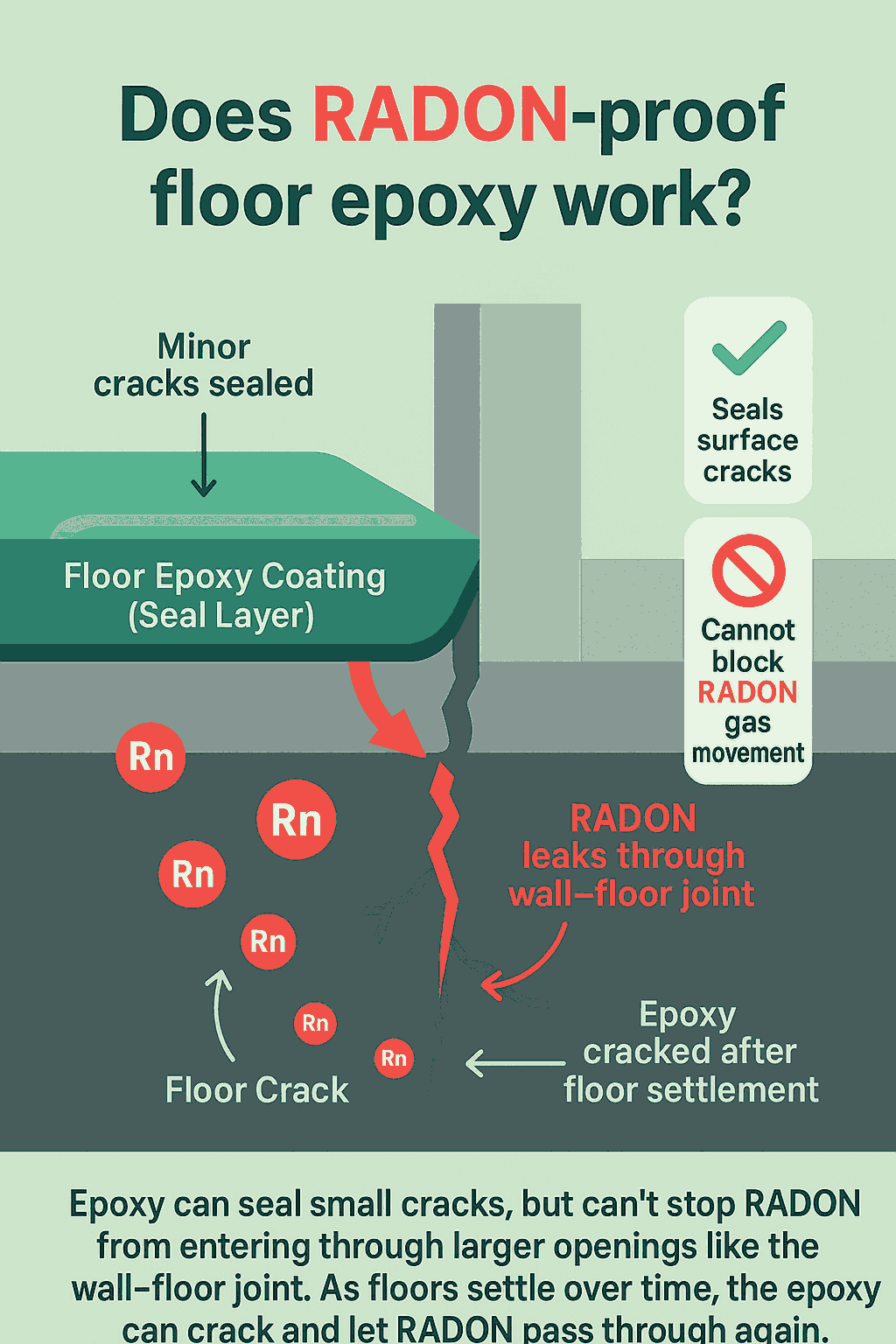 Epoxy coatings can help seal small cracks in the floor, but they can’t stop RADON from entering through larger openings - especially the wall–floor joint, which is the main entry path. If the floor moves or settles, the epoxy can crack, letting RADON gas pass through again