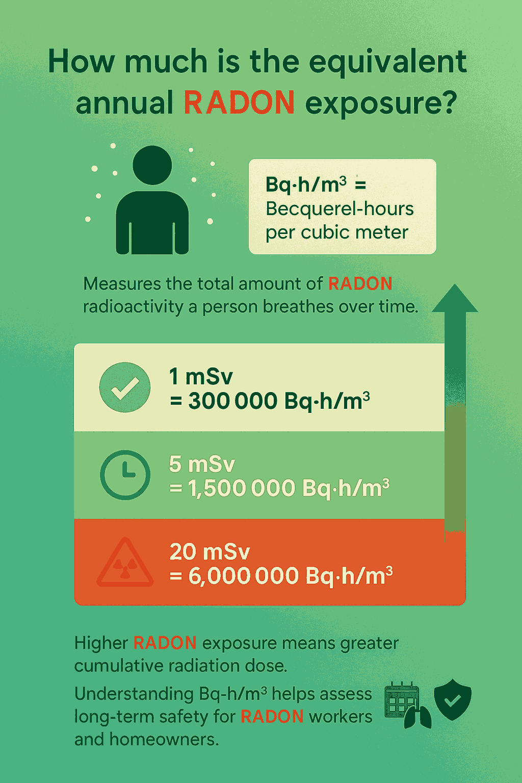 RADON exposure is often expressed as Bq·h/m³ (Becquerel-hours per cubic meter) - a measure of how much radon radioactivity a person is exposed to over time in a given space.