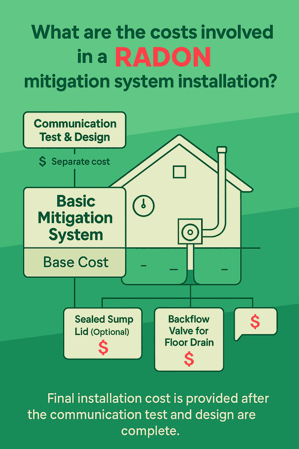We start with a basic mitigation system price, then adjust as needed for your home - for example, if you need a sealed sump lid, backflow valves for floor drains, or extra suction points. The total cost also depends on how many suction points and fans are required, and the type of fan installed for optimal performance.