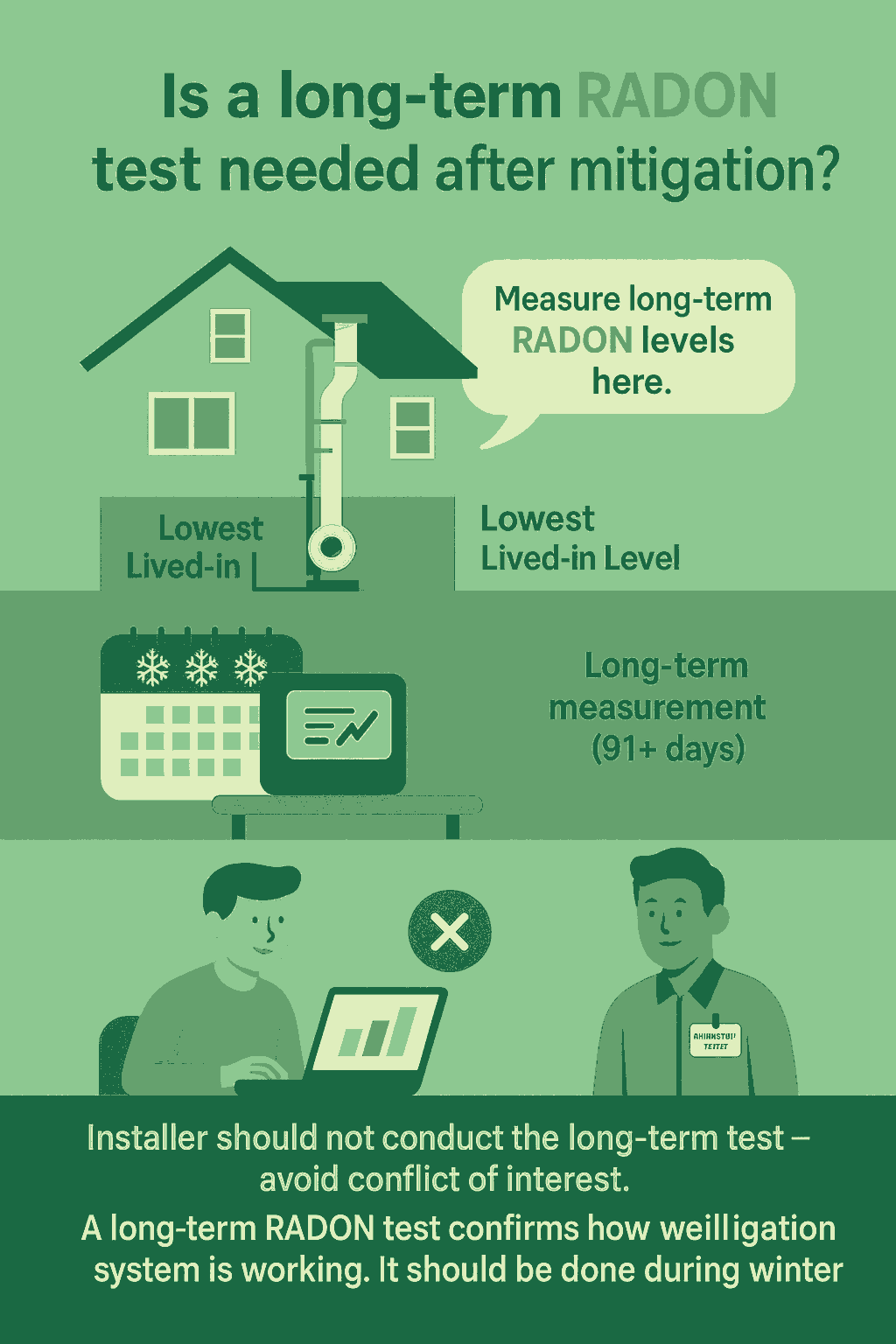 Yes. Health Canada recommends that the true effectiveness of a RADON mitigation system be confirmed with a long-term test in the same location as the original measurement - usually the lowest lived-in level of the home.