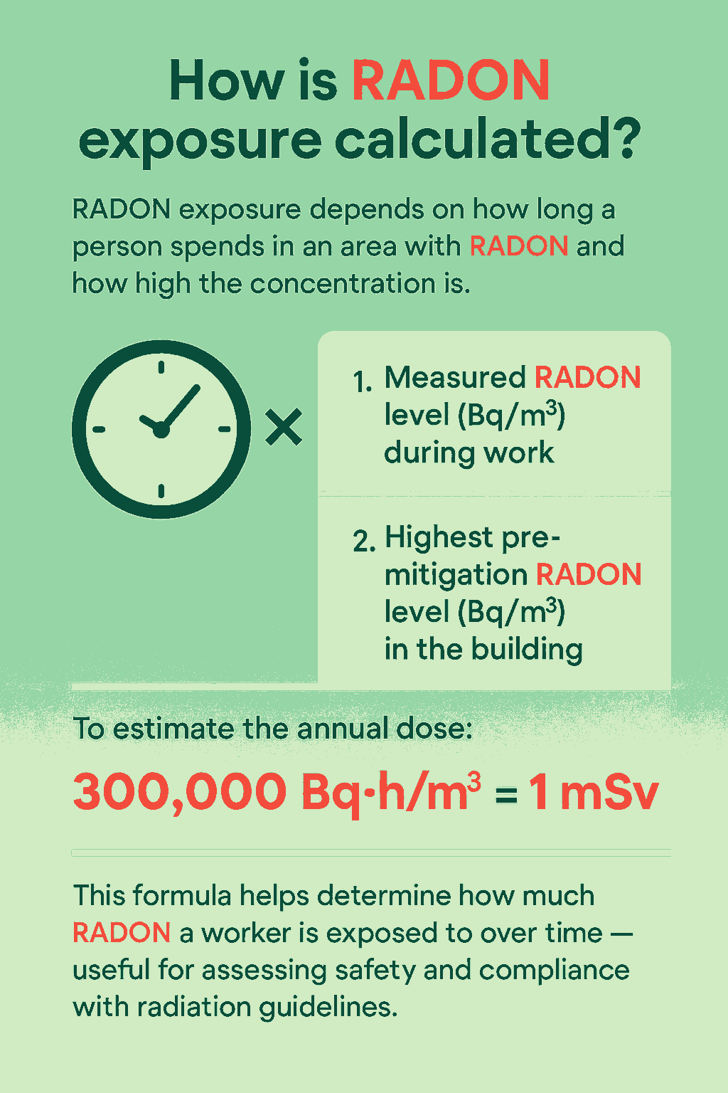 This formula helps determine how much RADON a worker is exposed to over time - useful for assessing safety and compliance with radiation guidelines.