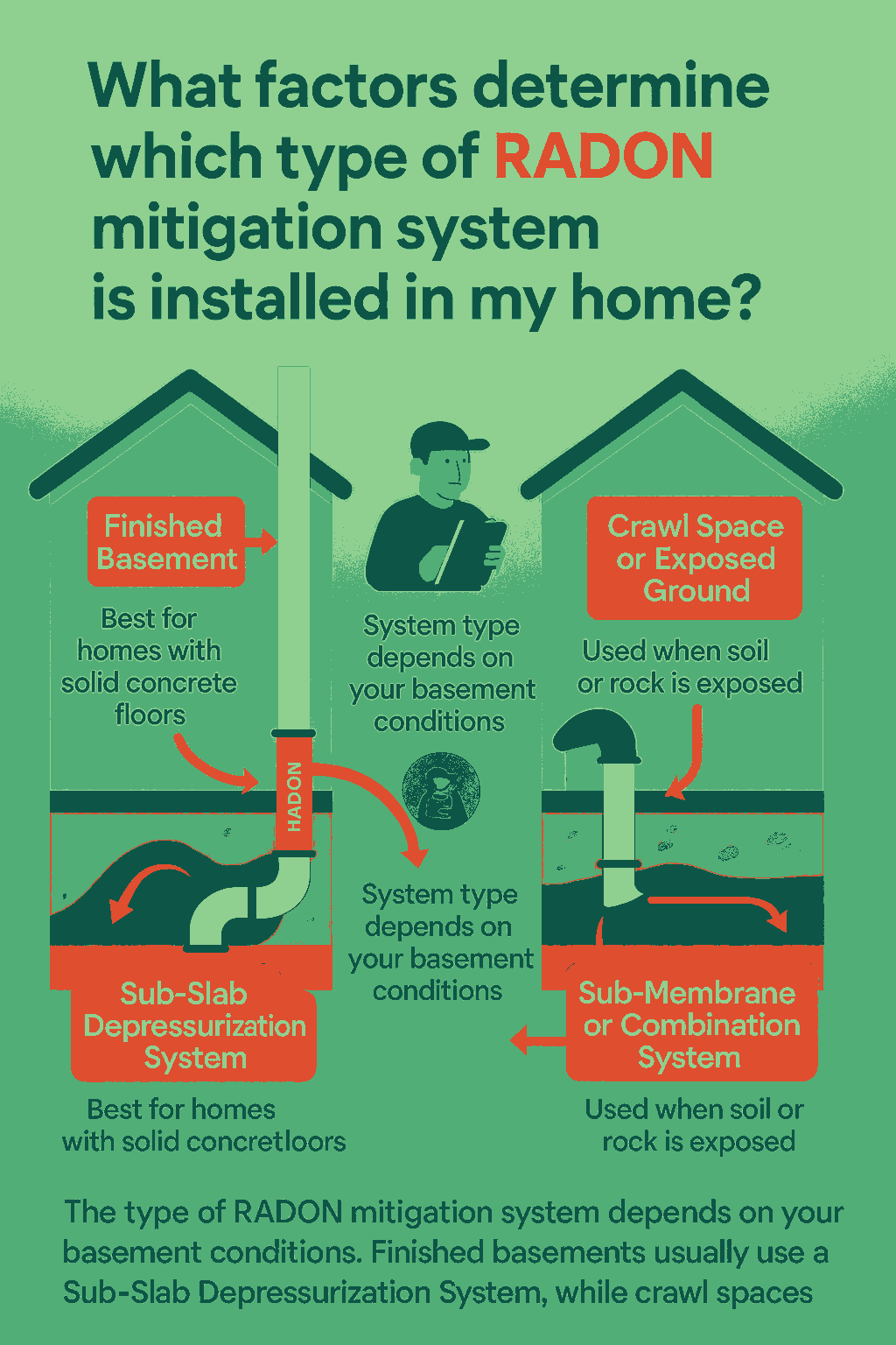 - If your home has crawl spaces, exposed dirt, or exposed rock, then a different or combined system may be needed to effectively remove RADON.
