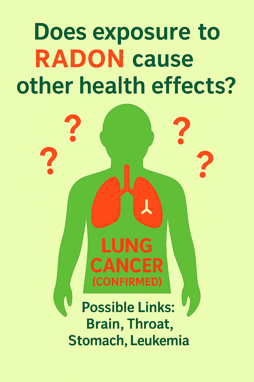 Currently, the only confirmed health effect from RADON exposure is lung cancer.