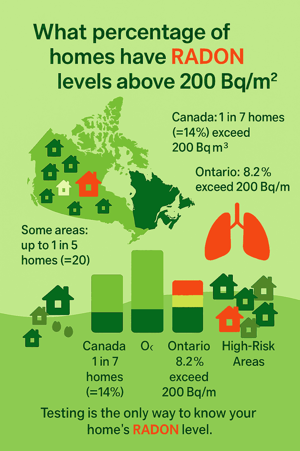 Across Canada, about 1 in 7 homes (around 14%) have RADON levels exceeding 200 Bq/m³, which is the Health Canada guideline.
