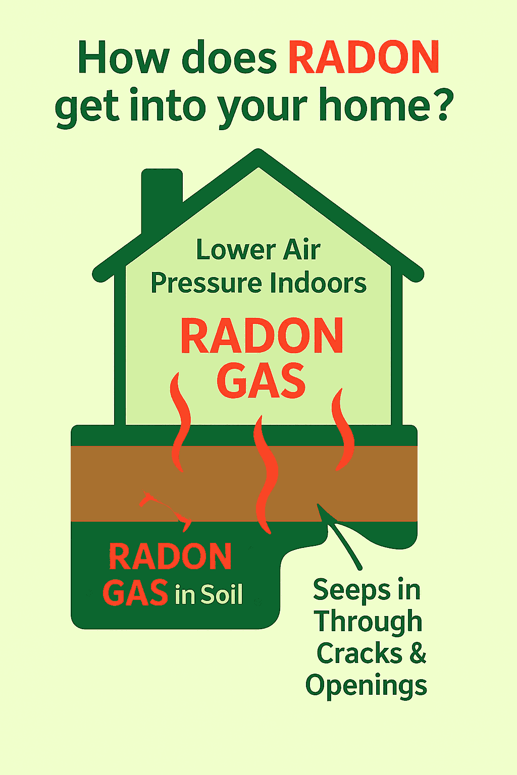 RADON moves from the ground into your home because indoor air pressure is lower than in the soil.