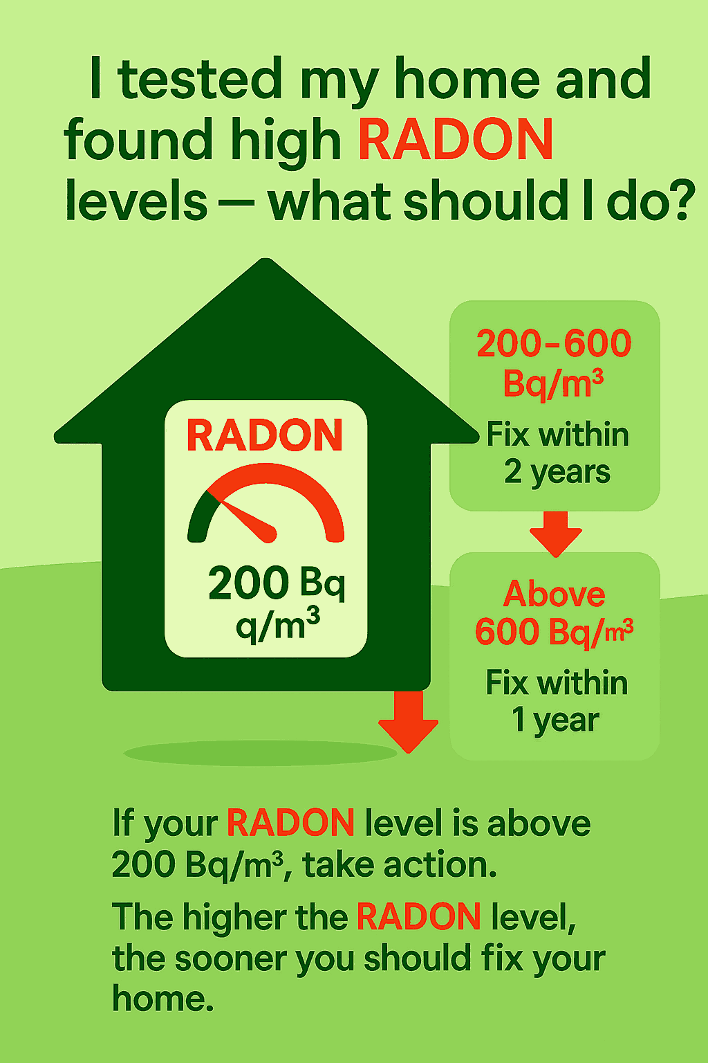 - Above 600 Bq/m³: Fix your home within 1 year.