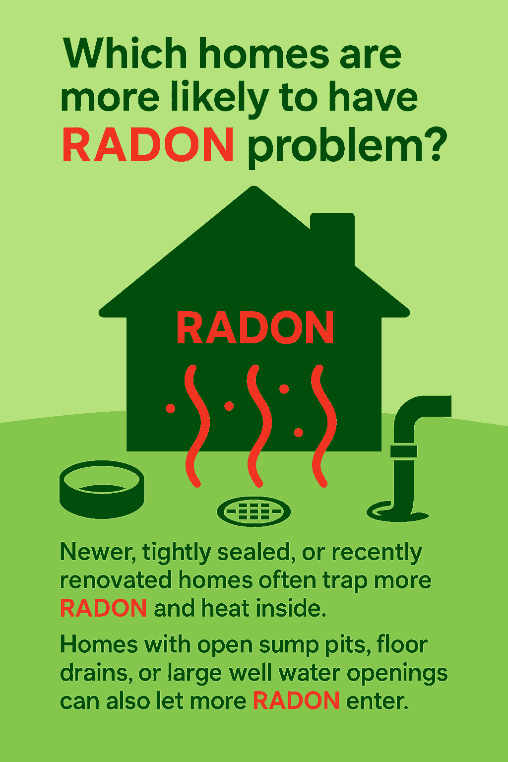 Homes with open sump pits, floor drains leading to soil, or large openings for well water lines can also let more RADON enter.