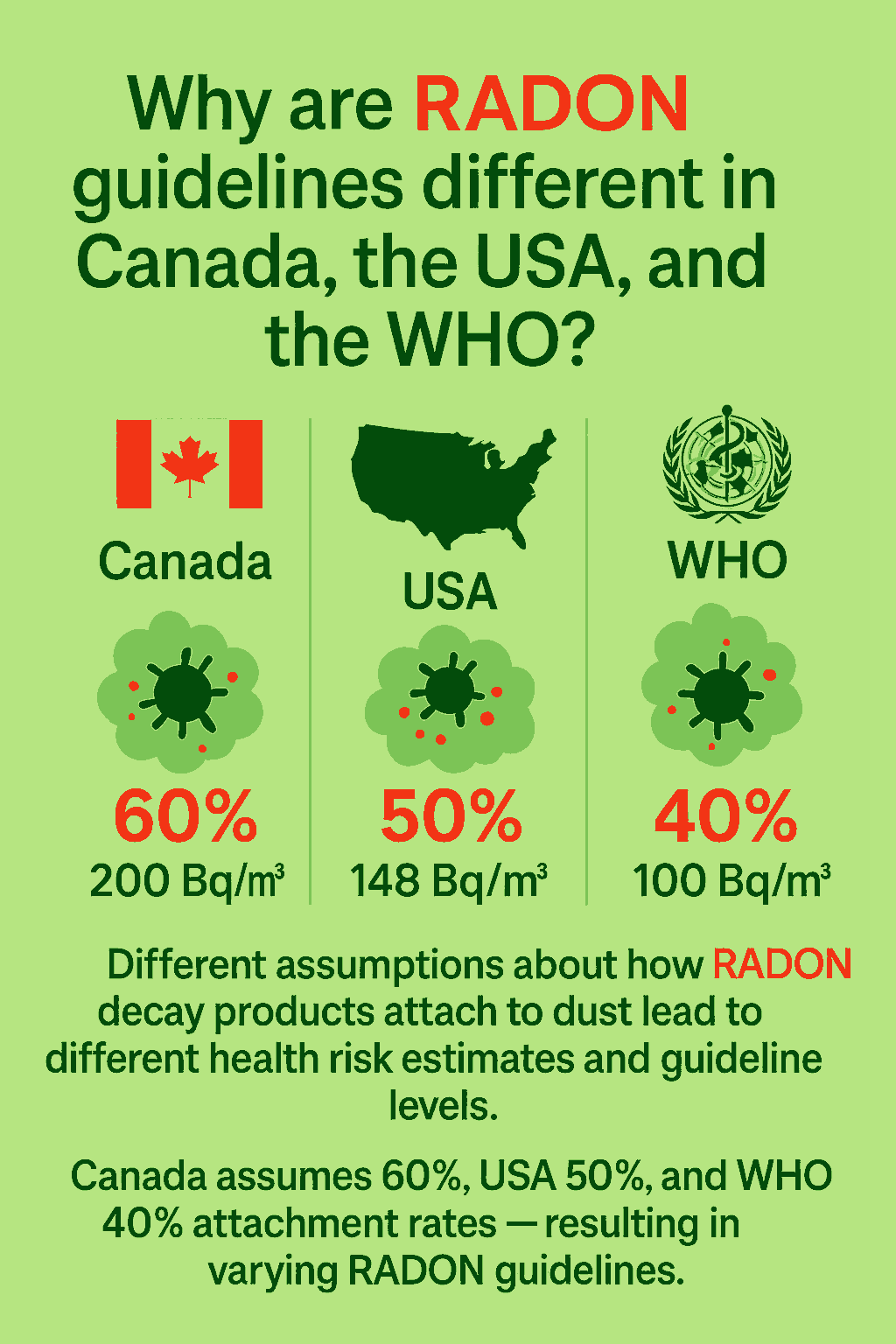 Each organization uses different assumptions about how RADON decay products (RDPs) attach to dust and particles in the air - which affects how much can be inhaled and how risky the exposure is.