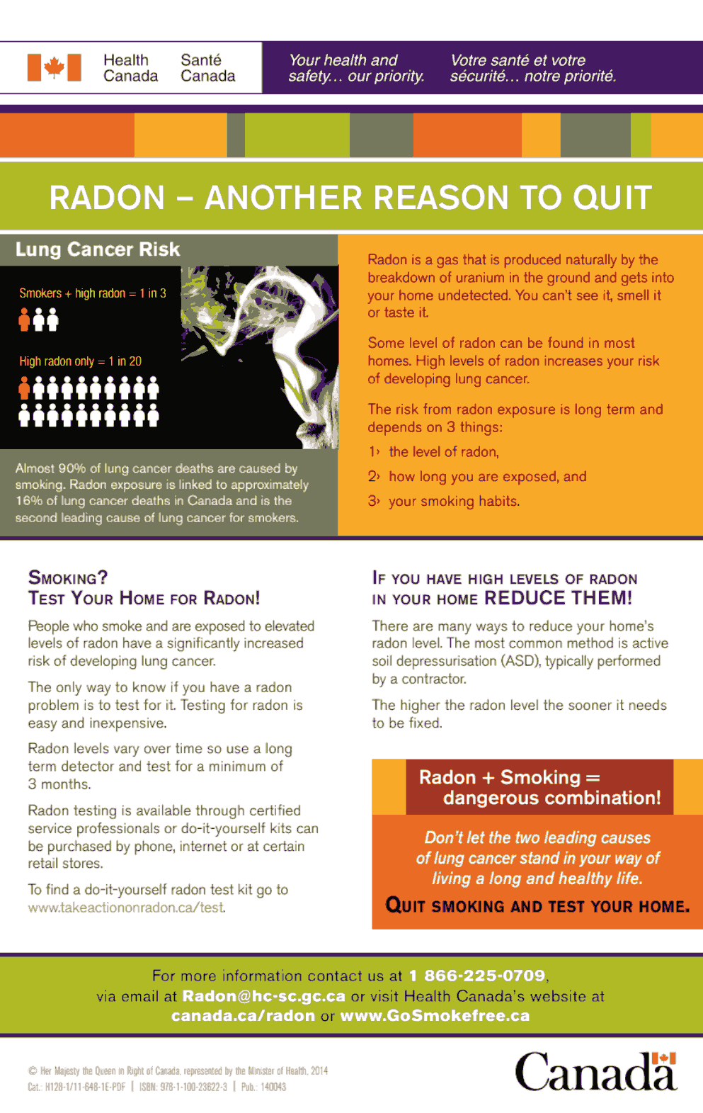 Exposure to elevated indoor radon levels and smoking together significantly increase lung cancer risk. A smoker exposed to high radon can face a 1-in-3 chance of developing lung cancer, compared with about 1-in-20 for a non-smoker at high radon. Canada Radon is an invisible, odourless radioactive gas; the only way to know your home’s level is to test with a long-term detector (minimum three months). Canada If levels exceed guidelines, reduce them - especially if you smoke. Quit smoking and test your home. Canada